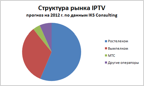 Лидерами по части IPTV по нашим прогнозам станут Ростелеком с базой в 1,4 млн пользователей (56% от всего рынка IPTV), Вымпелком и его 820 тысяч абонентов (33%) и МТС с показателем свыше 100 тысяч человек (4%)».