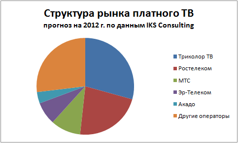 Схожую расстановку сил по итогам 2012 года прогнозирует и консалтинговое агентство IKS Consulting. По словам аналитика российского офиса компании Максима Савватина, ситуация сложится примерно следующая: «Суммарно абонентская база платного телевидения в России к концу этого года составит порядка 29,1 млн пользователей (за вычетом соцпакета и неактивных абонентов Триколор ТВ). Из них на IPTV придётся свыше 2,5 млн человек. При этом доминирующие позиции на рынке всего Pay TV займут Триколор с показателем в более чем 8,5 млн абонентов (IKS учитывает только активную абонентскую базу оператора, — примеч. автора) (порядка 29% от всего рынка), Ростелеком с 6,6 млн пользователями (23%), МТС с 2,9 млн абонентов (доля 10%), Эр-Телеком с базой в районе 2,2 млн человек и АКАДО, число абонентов которого составит около 1,1 млн человек.
