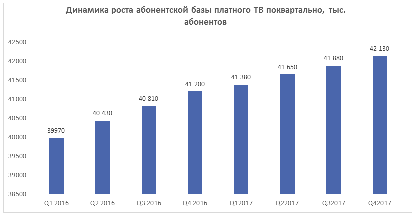 За квартал число абонентов увеличивалось всего лишь 0,25 млн новых подписчиков, а общая абонентская база в итоге составила 42,13 млн абонентов. В 2016 году их было 41,28 млн.