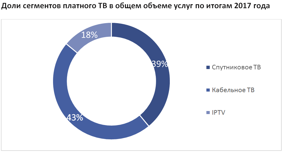 В итоге самым популярным на рынке пока по-прежнему остается кабельное ТВ: его доля в общем объеме услуг составила 43%. Показатели спутникового телевидения ненамного ниже: на него приходится 39% рынка. Доля IPTV в 2017 году составила 18%.