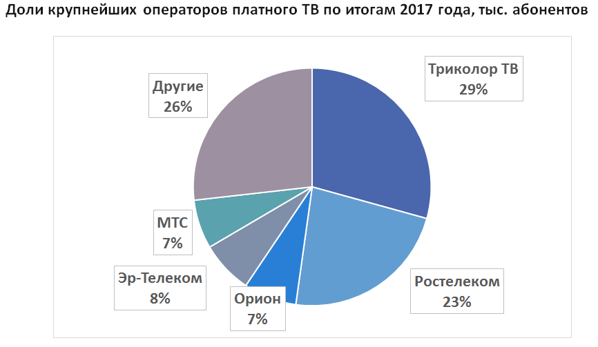 Лидер рынка, спутниковый оператор "Триколор ТВ", за 2017 год увеличил абонентскую базу на 140 тысяч подписчиков, до 12,28 млн домохозяйств. Второй по величине игрок, "Ростелеком", увеличил базу подписчиков на 480 тысяч, до 9,78 млн. Идущий третьим "Эр-Телеком" увеличил базу сразу на 372 тысяч абонентов, до 3,342 млн. Рост компании в 2017 году происходил в основном не из-за органического роста, а сделок M&A.