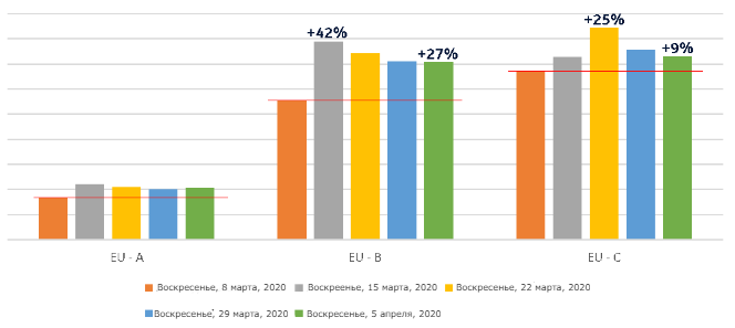 Если отсеять экстремальные случаи (т.е. некоторые сети, где трафик по сравнению с ситуацией до карантина вырос более чем на 60%), в европейских сетях пиковый трафик в выходные дни стабилизировался на уровнях, намного превышающих докризисный.