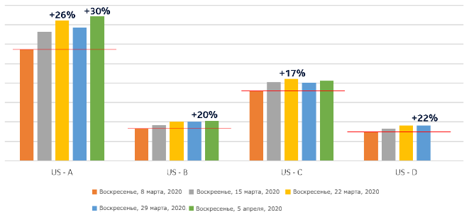 Эволюция пикового (воскресного) трафика в марте 2020 года в американских сетях