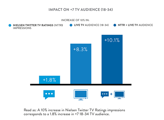 Собственно, количество твитов о том или ином шоу также является важным фактором для просмотра контента в пост-семидневном режиме. Аналитики пришли к такому выводу, сравнив идентичные по характеристикам ТВ-сериалы (то есть одинаковые по времени показа, жанру, продолжительности, языку, типу вещания и т. д.) с разным уровнем "социальности" — высоким и низким. У "высоко-социальных" шоу (то есть тех, о которых пользователи оставляли больше твитов) размер "+7-аудитории" оказался на 36% больше, чем "живой" аудитории, а у "низко-социальной" — лишь на 16% больше.