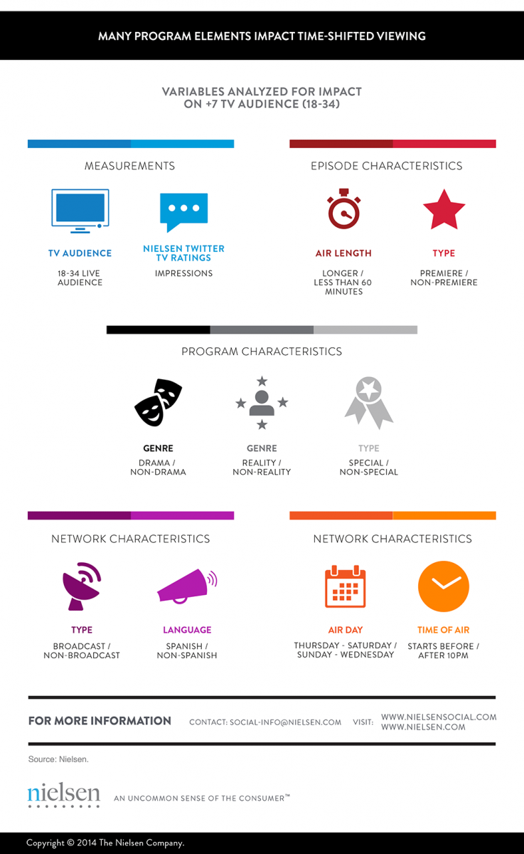 Чтобы оценить природу появления такого "+7"-видеопотребления, Nielsen оценил 11 различных характеристик (включая жанр, продолжительность, время показа, премьерность эпизодов и программ и т. д.) по пяти категориям, которые помогли аналитической компании понять — какие факторы влияют на решение аудитории посмотреть шоу позднее на неделе.