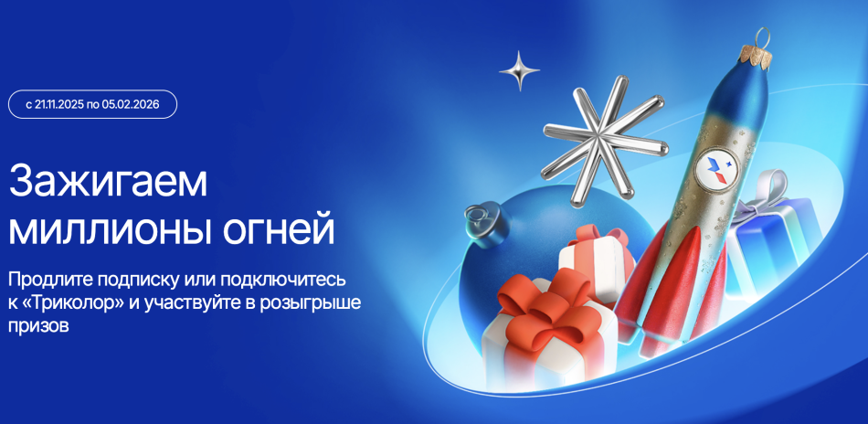 "Триколор" проводит праздничную акцию, приуроченную к завершению юбилейного года. Главный приз – поездка на Байконур на запуск ракеты. Участвовать можно до 18 января 2026 года включительно, и компания гарантирует подарок каждому участнику – фирменную LED-лампу. Для участия в розыгрыше необходимо продлить подписку или подключиться к "Триколор".