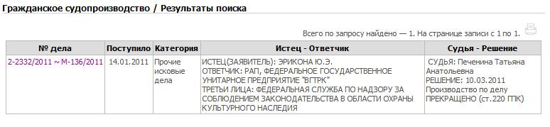 Еще одним примером подобного случая можно считать иск композитора Юрия Эриконы, поданный 14 января 2011 года (№ дела: 2-2332/2011) в Пресненский районный суд г. Москвы. Предметом данного иска также являлось недополученное авторское вознаграждения. Оно причиталось композитору за показ на каналах ВГТРК телесериала «Гонка за счастьем», автором музыки к которому он являлся. Заявленная к взысканию сумма тогда составила 5,8 млн. руб. Но, как только заинтересованные лица (РАО и ВГТРК) узнали о нахождении искового заявления в суде, их представители немедленно стали пытаться провести консультации с Ю. Эриконой для разрешения этого конфликта в досудебном порядке.