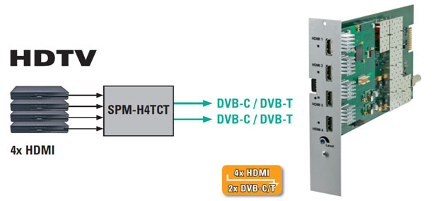 Модуль SPMH4TCT можно устанавливать в базовый блок головной станции Polytron SPM 2.000 tele (до 6 модулей через 24 HDMI-входа) или базовый блок головной станции Polytron SPM 200 digi (до 2 модулей через 8 HDMI-входов).