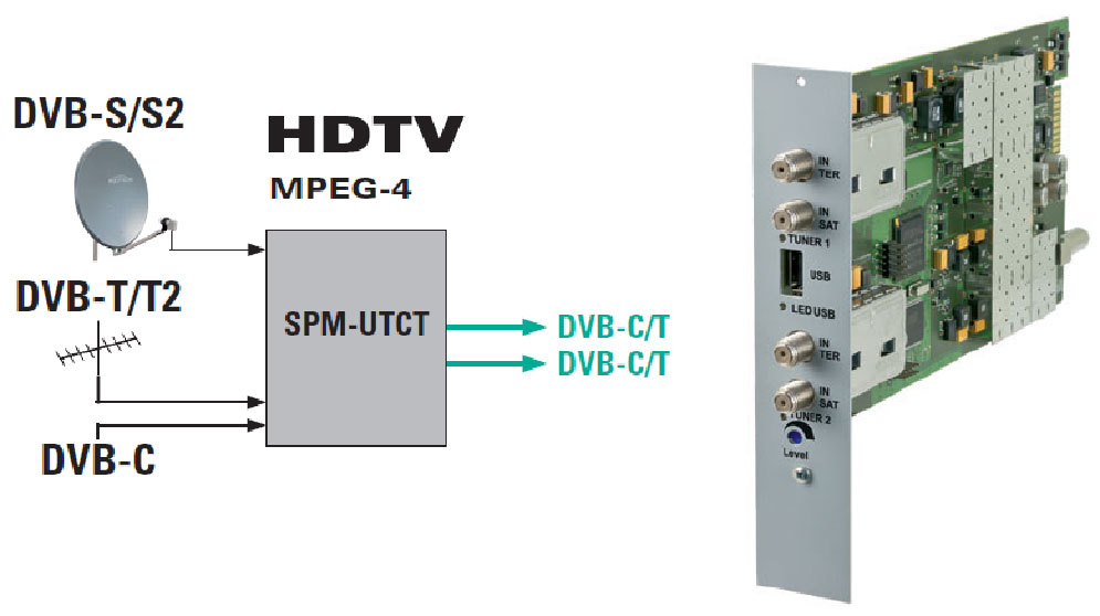 Универсальный приемный модуль SPM-UTCT также обладает функциями удаления ненужного контента (TSP), поддерживает стандарты MPEG 2 и MPEG 4.
