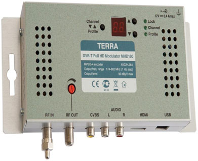 MHD100 — цифровой модулятор DVB-T производства TERRA (Литва) — позволяет сформировать DVB-T сигнал высокой четкости от разных источников — спутниковых ресиверов, камер охраны, видеомагнитофонов, компьютеров. Новый модулятор дает возможность организовать вещание цифрового контента в HD на базе действующей коаксиальной разводки.