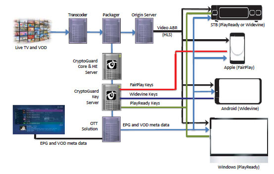 Apple Fair Play, Google Widevine и Microsoft PlayReady бесплатны для пользователей и одобрены студиями, поэтому подход CryptoGuard к DRM заключается в том, чтобы поддерживать эти DRM системы из единой головной станции. Другими словами, оператор может управлять всеми правами на контент пользователей и устройств из головной станции CryptoGuard, обходя установки и ограничения тех или иных каналов на свои программы с помощью сравнения прав и выбора оптимальных условий.