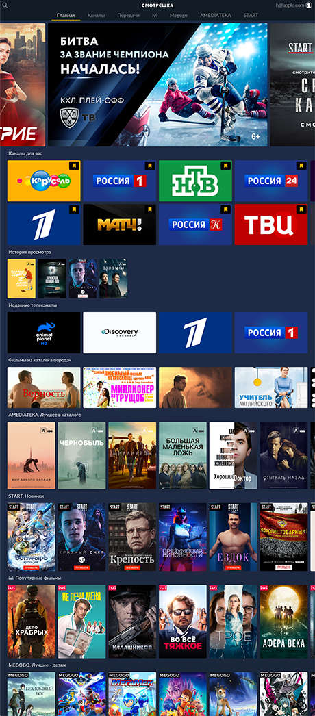 Поэтому мы создали "умную" витрину, которая решает две ключевые задачи: быстрый доступ к привычному контенту и удобный поиск нового. Нам было важно предложить пользователю интересный, свежий и разнообразный контент (каналы, передачи и фильмы) “на блюдечке”, избавив его от долгих поисков.