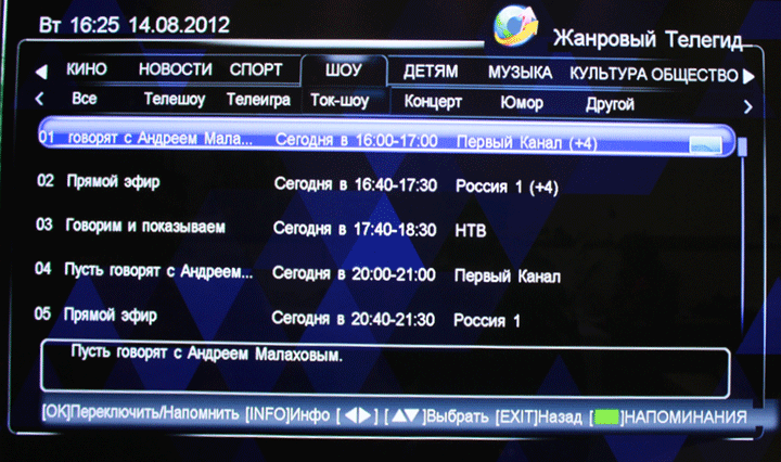 И это значительно облегчает навигацию. Ведь, если во время просмотра программы из подкатегории «телеигра» категории «шоу», нажать на жёлтую кнопку (или дважды на кнопку EPG) абонент попадёт в меню с расписанием всех телеигр (программ, отнесённых к этой подкатегории) на сегодняшний день. Из этого меню пользователь может перейти к просмотру нужной передачи или — если она ещё не началась — запрограммировать переход на телеканал с этой передачей в нужное время.