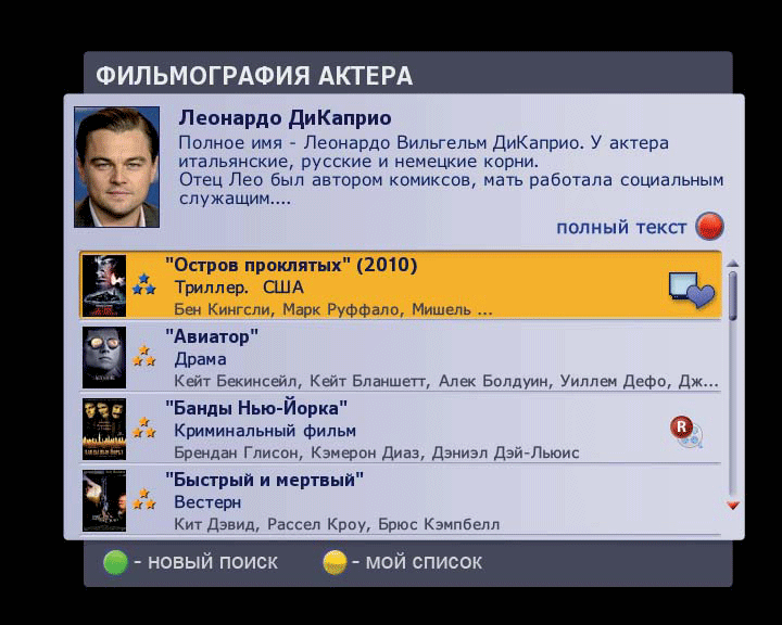 Из меню поиска можно зайти в меню описания фильма, посмотреть его актерскую группу, узнать режиссера. На каждого актера и режиссера в меню «Актив ТВ» имеется подробная фильмография. То есть, абоненты могут не только найти для себя информацию о ближайшем времени выхода фильма с нужным актером, но и подробнее ознакомиться с его творчеством. Сервис включает в себя и биографическую информацию об интересующем человеке. Например, о Леонардо Ди Каприо можно узнать, что он имеет итальянские, русские и немецкие корни, а его отец был автором комиксов.