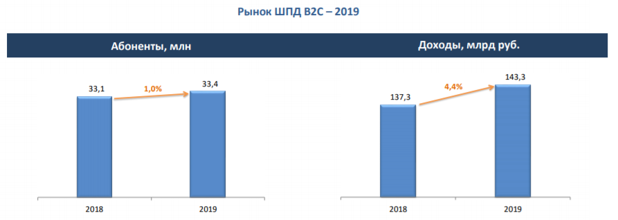 По оценке "ТМТ Консалтинг", на конец 2019 года количество абонентов широкополосного доступа в интернет в сегменте частных лиц в России достигло 33,4 млн, проникновение приблизилось к 60%. Объем рынка составил 143,3 млрд рублей.