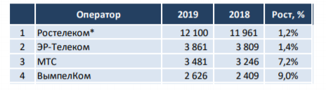 - По итогам 2018 года крупнейший российский оператор ШПД "Ростелеком" увеличил свою абонентскую базу на 139 тыс. абонентов (или на 1,2%). При этом в 2019 году "Ростелеком" стал наиболее заметным игроком в сфере слияний и поглощений на федеральном уровне. Оператор приобрел более 10 интернетпровайдеров, в т.ч. "Альянс Телеком", "Прометей" и "Сумму Телеком".