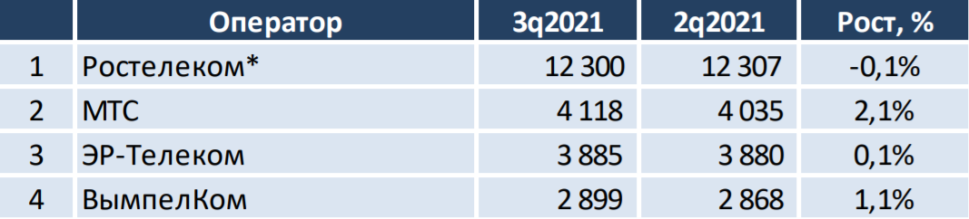 Крупнейшие российские операторы ШПД, 3 кв. 2021