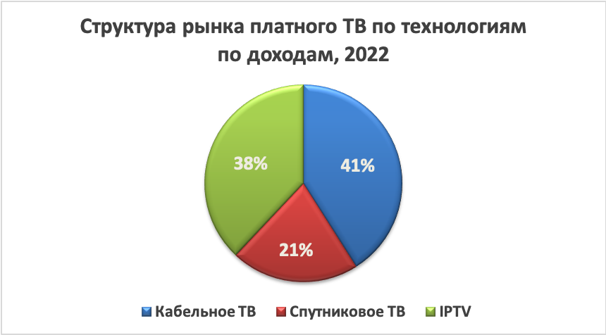 В результате разнонаправленной динамики структура рынка по технологиям немного изменилась: в структуре абонентской базы доля IPTV выросла с 24 до 25%, доля КТВ снизились с 39 до 38%. В структуре выручки на 2 п.п. выросла доля IPTV, на столько же снизилась доля спутникового ТВ.