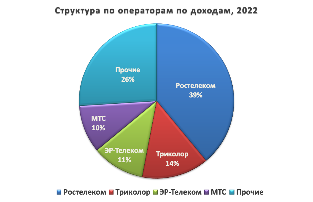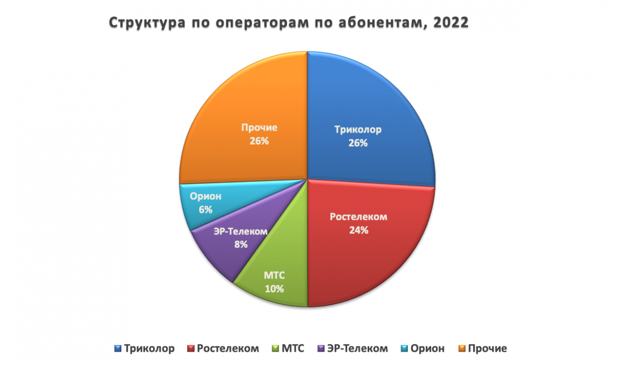 Сегодня тотальному снижению числа подписчиков препятствует продолжающийся рост числа абонентов IPTV. Происходит он благодаря строительству и модернизации сетей, распространению пакетных тарифных планов и включению операторами в пакеты услуг доступа к онлайн-кинотеатрам. По оценкам "ТМТ Консалтинг", прирост числа IPTV-пользователей в 2022 году составил около 420 тыс. Традиционно основной вклад в него внесли крупнейшие ШПД-провайдеры "Ростелеком" и МТС. На долю локальных операторов пришлось всего около 5% новых подключений.