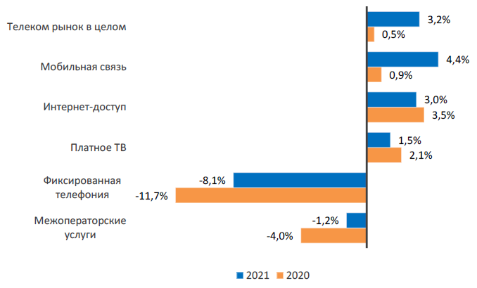 По предварительным данным "ТМТ Консалтинг", объем рынка телекоммуникаций в 2021 году превысил 1,8 трлн руб. Годовая динамика рынка составила 3,2%, это один из самых высоких показателей за последние годы. Основным фактором роста выступило восстановление рынка мобильной связи. В то же время в таких значимых сегментах, как фиксированный широкополосный доступ в интернет и платное ТВ наблюдается замедление динамики: темпы прироста абонбазы снизились после подключений в период самоизоляции 2020 года, а увеличение тарифов имело локальный характер.