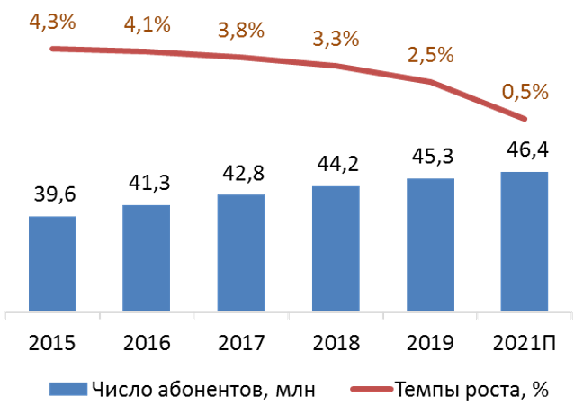 Рост рынка платного ТВ почти остановился: по предварительным итогам 2021 года, абонентская база увеличилась всего на 0,5% (против 1,8% в 2020 году) и достигла 46,4 млн. Проникновение услуги зафиксировалось на уровне 82%. Практически единственной точкой роста остался перевод операторами ШПД своих пользователей на пакетные тарифы с IPTV. Отток в сегменте КТВ несколько замедлила продолжающаяся пандемия COVID-19 и вызванные ею низкая мобильность граждан и повышенный интерес к телесмотрению как к одному из основных видов досуга. В свою очередь, негативное влияние на динамику абонентской базы платного ТВ оказал рост числа конкурирующих предложений со стороны не операторских видеосервисов.