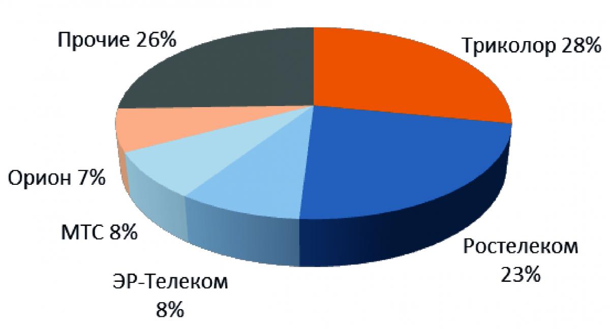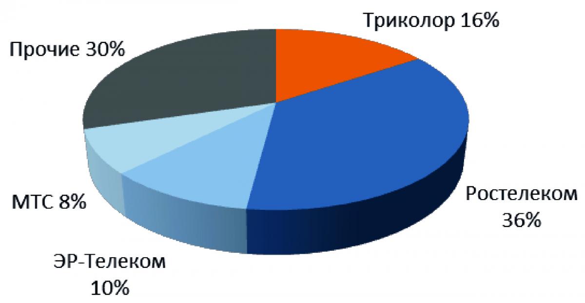 В структуре выручки продолжает расти доля "Ростелекома" - оператор занимает уже свыше трети рынка, более чем в два раза опережая крупнейшего по размеру абонентской базы "Триколора".
