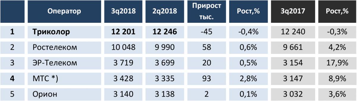 По итогам квартала лидером и по темпам роста, и по абсолютному приросту абонентской базы стал оператор МТС, подключивший 75 тысяч пользователей к спутниковому ТВ и 18 тысяч – к проводным технологиям платного ТВ. Абонентская база пользователей второго по величине "Ростелекома" в третьем квартале превысила 10 млн абонентов. В итоге даже без M&A-сделок, только за счет органического роста операторы из ТОП-5 суммарно выросли почти на 128 тысяч.