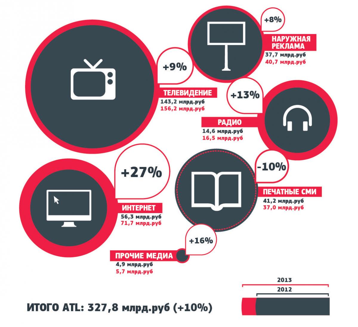 Большую часть рекламных доходов традиционно получило эфирное ТВ — его доля в общем объеме составила 152,2 млрд рублей. А на кабельно-спутниковый сегмент пришлось 4 млрд рублей. Что у одного, что у другого сектора доходы от рекламы по сравнению с 2012 годом возросли — у эфирного на 9%, а у КСК — на 20%. Однако, если первый сегмент продемонстрировал стабильность в росте (по итогам 2012 года рекламные доходы эфирных каналов тоже показывали рост на 9%), то второй — небольшое замедление темпов роста (20% в 2013 году по сравнению с 27% в 2012-ом).