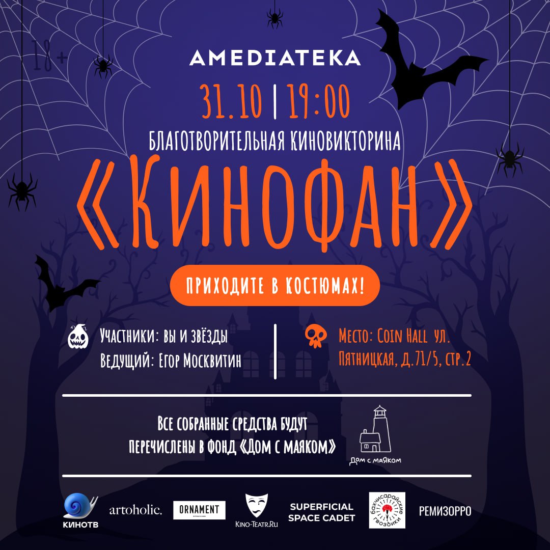 "Амедиатека" поддержала благотворительную викторину "Кинофан", которая пройдет 31 октября в Москве. Гостей ждут увлекательный квиз, атмосферный маскарад, конкурсы, призы — и благотворительный аукцион: все средства, собранные на "Кинофане", будут направлены в поддержку Детского хосписа "Дом с маяком". Также платформа на своем ресурсе предложила аудитории подборку "Что посмотреть на Хэллоуин".