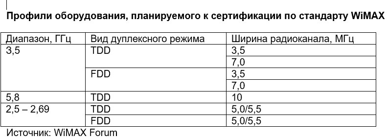 В результате неоднозначности стандарта WiMAX уже сегодня существует не менее семи его версий или в терминологии WiMax Forum - профилей (см. таблицу). Как уже упоминалось, сертификация WiMAX-оборудования будет проводиться для трех диапазонов - 2,5; 3,5 и 5,8 ГГц. Последние два мало волнуют операторов сетей ЭКТВ, а вот первый (2,5 - 2,7 ГГц), как это не прискорбно, практически полностью совпадает с полосами BRS/EBS, а это значит, что через несколько лет на рынке появится уйма оборудования ШБД, частоты для которого в России заняты (в крупных городах почти полностью) сетями ЭКТВ. У кого-то может возникнуть вполне резонный вопрос, а не появится ли у Мининформсвязи или в Государственной комиссии по радиочастотам (ГКРЧ) желание освободить эти частоты, занятые технологией 70-х годов прошлого века (да-да, именно тогда в США появились первые аналоговые сети ЭКТВ в диапазоне MMDS), да еще не "европейской" (в Европейском Союзе диапазон 2,5 - 2,7 ГГц всегда предназначался другим РЭС), для более "прогрессивных" сетей WiMAX?