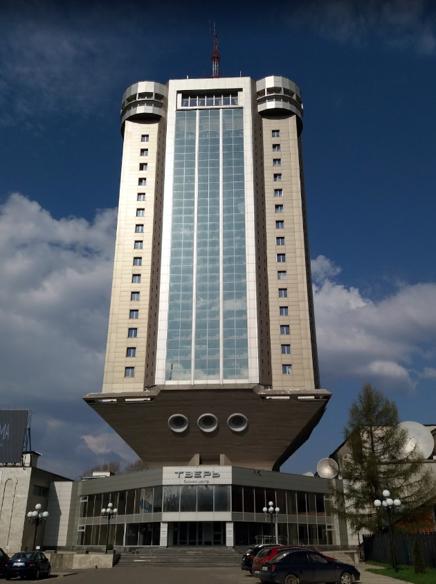 Гостиница "Тверь", в народе называемая "рюмкой", с передающей ТВ-антенной телеканала "Тверской проспект" на крыше
