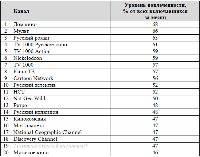 Таблица 1. Топ-20 платных каналов по уровню вовлеченности их аудитории в просмотр