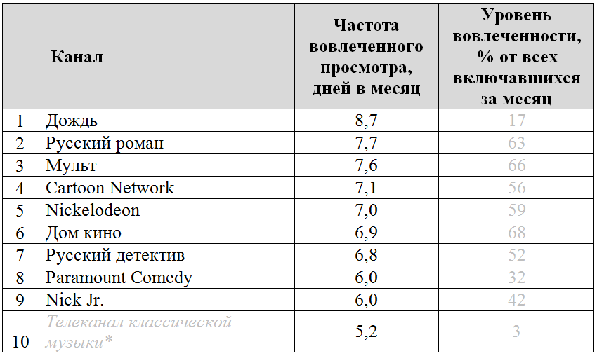 Да, аудитория может быть узкой, но крайне лояльной, как у телеканалов, оказавшихся на первом и десятом местах по частоте вовлеченного просмотра (см. таблицу 2). Но даже их аудитория вовлеченно смотрит от пяти до девяти дней в месяц, то есть примерно раз в неделю.