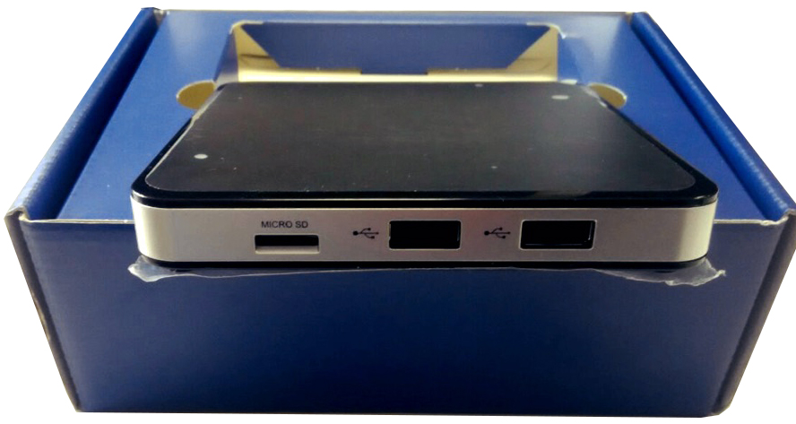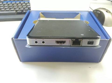 В коробке у нас есть cобственно сам медиацентр. С одной стороны у него питание DC-12V (блок питания будет дальше), RJ-45 разъем, HDMI-выход "до 1080p" (так написано в инструкции), 3,5 мм гнездышко для AV и еще одно похожее — для "удлинителя ИК-датчика".