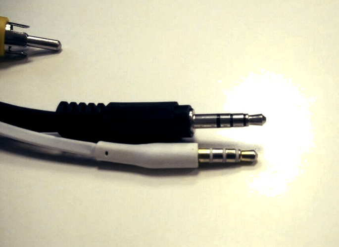 Незадача заключалась в том, что на простом офисном мониторе отсутствует звук. А без звука смотреть видео не очень удобно. Но наушники у меня нашлись. Но AV-выход — это не совсем наушники. Черный — это кабель AV-out->"тюльпан" и штекер у него на пару миллиметров длиннее. При этом, наушники подключить можно, и они даже будут работать. Но нужно "поймать момент" при их подключении — вставлять не до упора, что требует некоторой подготовки и знания основ электроники, которая, как известно — "наука о контактах".