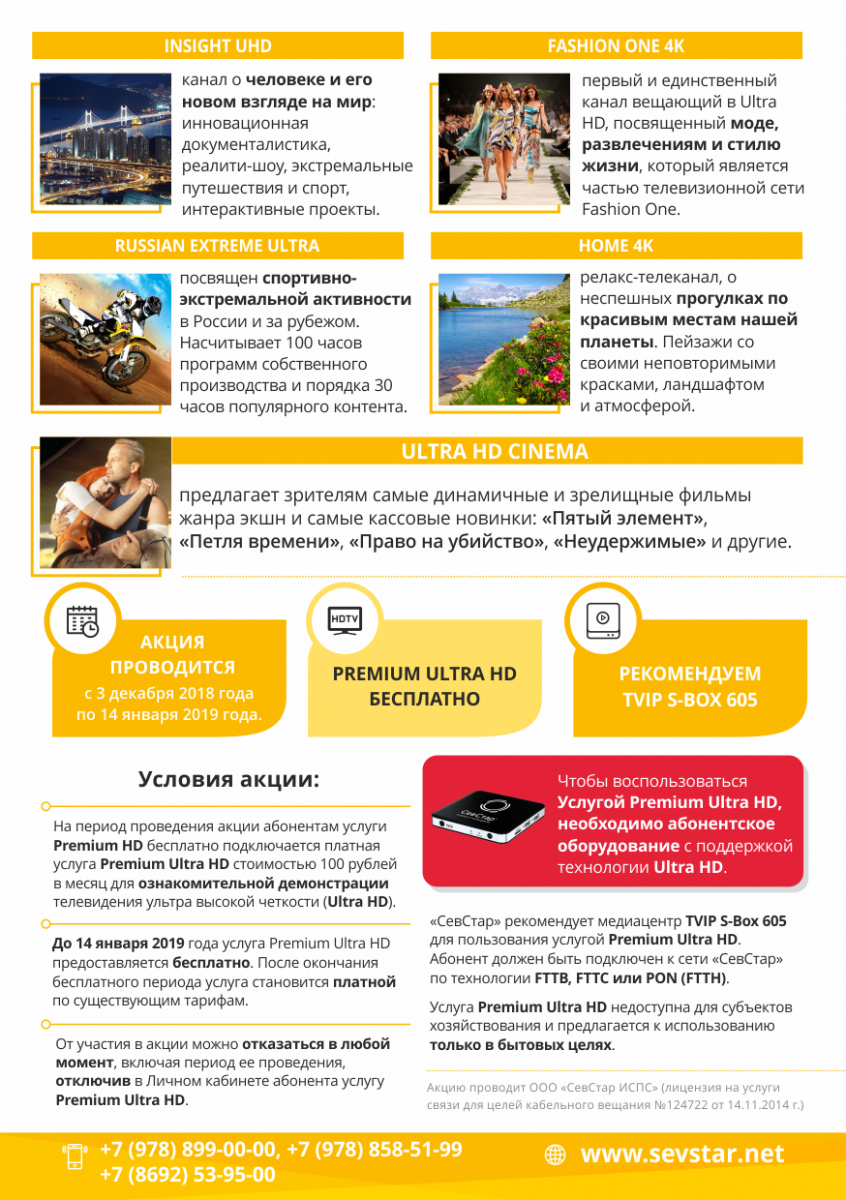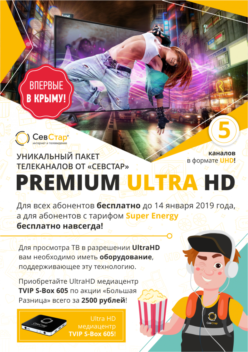 С апреля прошлого года мы предлагаем абонентам только UltraHD приставку как основную. Прошло уже шесть лет с момента массового запуска услуги цифрового телевидения, и у людей накопилось определенное количество устаревших приставок: они выходят из строя, так как их срок службы подходит к концу, и люди вынуждены менять их на новое оборудование. А тут мы, со своими предложениями, с акциями, со скидками, с UltraHD. И, если абонент хочет купить приставку со скидкой, он автоматически соглашается, по условиям акции, подключить себе UltraHD пакет и пользоваться им в течение года.