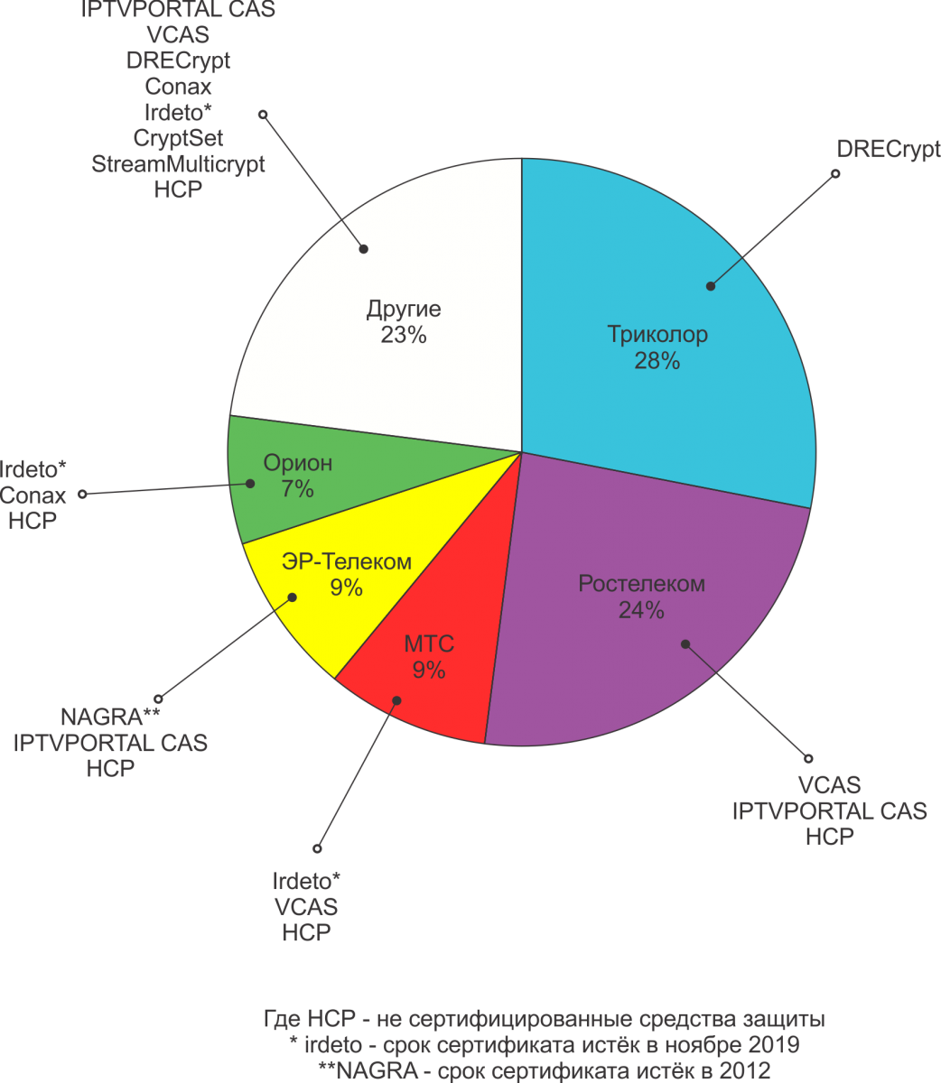 А еще интересно посмотреть на рынок потребления контента через призму сертифицированных систем защиты контента. На сегодня (согласно реестру зарегистрированных сертификатов соответствия на средства связи) мы имеем следующую картину.