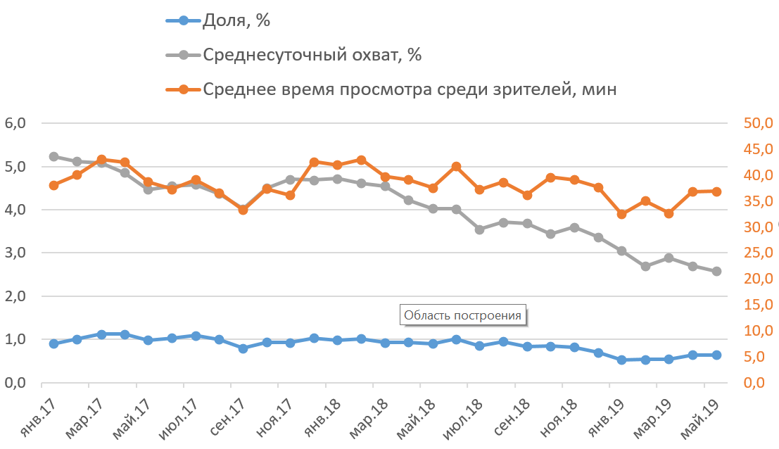 Доля аудитории (%) - среднее количество человек, смотревших телеканал, выраженное в процентах от общей численности телезрителей в данный момент времени. И тут мы видим достаточно ровную и убедительную прямую до сентября 2018 года, где появляется отчетливое снижение показателя – и в январе он существенно снижается почти вдвое, снова начиная подрастать с марта-апреля.