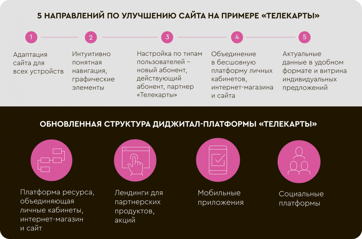 В целом, сайт спутникового оператора сегодня – часть омниканального взаимодействия с абонентом. Он не только решает информационные задачи, но и собирает лиды, непосредственно продает продукт, решает задачи по обслуживанию, тем самым снимая нагрузку и дополняя офлайн-каналы оператора. Но если обратиться к трендам (рост доли мобильности и роли социальных платформ в коммуникации с пользователем), становится очевидным, что в недалеком будущем существенная доля абонентов вообще перестанет пользоваться сайтом. Все бóльшую роль во взаимодействии с ними будут играть мобильные приложения личного кабинета, чат-боты. И, разумеется, уже сейчас эти инструменты необходимо развивать наряду с сайтом, чтобы предоставить пользователям необходимые им точки касания и новый опыт для коммуникации с оператором.
