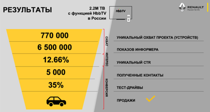 Компания "Рено" поделилась результатами своей рекламной кампании, где очевидно, что телевизионная реклама становится не только инструментом построения бренда, но и эффективным инструментом performance marketing, позволяющим отследить всю воронку, включая конвертацию в продажи. Тот факт, что 35% из записавшихся на тест-драйв дошли до дилерского центра, говорит о сверхэффективности канала. И это еще не финальная цифра.