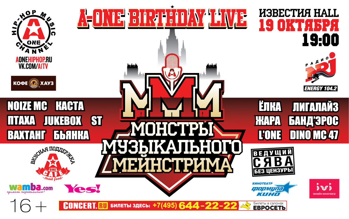 19 октября A-ONE HIP-HOP MUSIC CHANNEL собирает друзей в одном из самых модных мест Москвы — клубе “Известия Hall”, чтобы в очередной раз отметить свой День Рождения грандиозным событием A-ONE BIRTHDAY LIVE “МОНСТРЫ МУЗЫКАЛЬНОГО МЕЙНСТРИМА”.