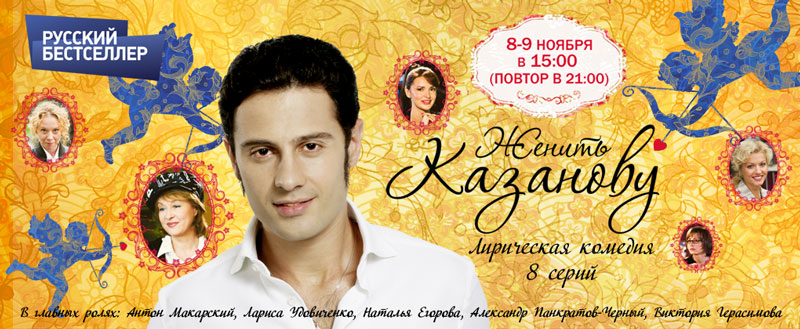 8 и 9 ноября в 15:00 смотрите на телеканале “Русский бестселлер” 8-серийную лирическую комедию “ЖЕНИТЬ КАЗАНОВУ” (повтор в 21:00). Это веселый фильм о молодом, успешном в бизнесе, беззаботном повесе, который совсем не дорожит женщинами и отношениями и регулярно встречается с бедными барышнями, разбивая им сердца. Роль главного героя исполнил популярный российский актёр Антон Макарский, известный зрителям по фильмам “Возвращение мушкетеров”, “Даша Васильева. Любительница частного сыска” и “Бедная Настя”. Других основных персонажей в фильме сыграли маститые звезды российского кино Лариса Удовиченко, Наталья Егорова, Александр Панкратов-Черный и многие другие.