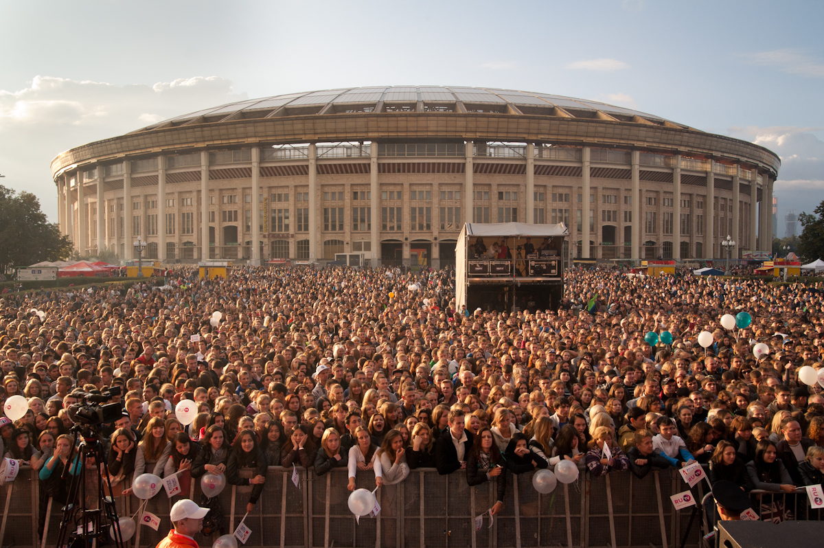 Задолго до начала шоу на огромной площади перед главной сценой “Лужников” собралось несколько тысяч человек, пришедших увидеть концерт, который по ежегодной традиции дарят телеканал RU.TV и радиостанция “Русское Радио” любимому городу.