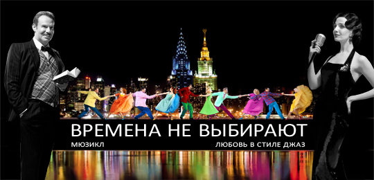 Мюзикл “Времена не выбирают” — это красивая история любви американской певицы и советского музыканта. Он и она. Нью-Йорк и Москва. Она — звезда американского джаза. Он — молодой советский пианист. Их случайная встреча в Москве стала началом головокружительного романа, но им не позволили быть вместе. Спустя десятилетия их сын Мэтт узнал и рассказал миру их удивительную историю.