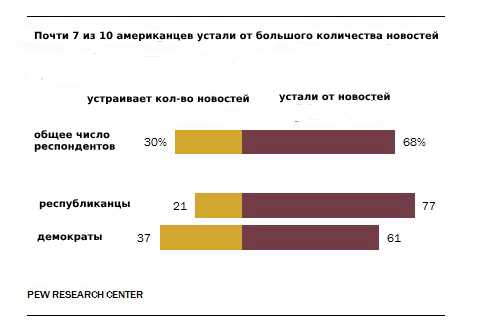 Как пишет Pew, согласно опросу, проведенному в конце февраля 2018 года, 68% жителей США устали от новостей, а 32% американцев вполне устраивает объем информации. Исследователи отмечают, что эта пропорция идентична данным исследования 2016 года, в котором было выявлено, что большинство американцев чувствовали усталость от освещения предвыборной гонки в США.