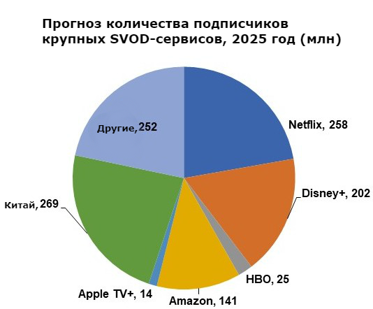В отчете также указано, что к 2025 году пять крупных платформ — Netflix, Disney, Amazon Prime Video, HBO и Apple TV+ — совокупно будут иметь 640 млн подписчиков. Аналитики также указывают, что через пять лет количество подписчиков Disney вырастет примерно на 176 млн, тогда как у Netflix цифры скромнее — эксперты ожидают, что абонбаза вырастет на 91 млн.