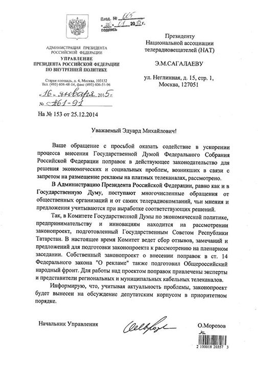 Национальная ассоциация телерадиовещателей получила ответ от Администрации Президента РФ на свое письмо с просьбой оказать содействие в ускорении процесса внесения Государственной Думой поправок в действующее законодательство "для решения экономических и социальных проблем, возникших в связи с запретом на размещение рекламы на платных телеканалах". На запрос НАТ ответил начальник управления Президента РФ по внутренней политике Олег Морозов, заявив, что "учитывая актуальность проблемы, законопроект будет внесен на обсуждение депутатским корпусом в приоритетном порядке".