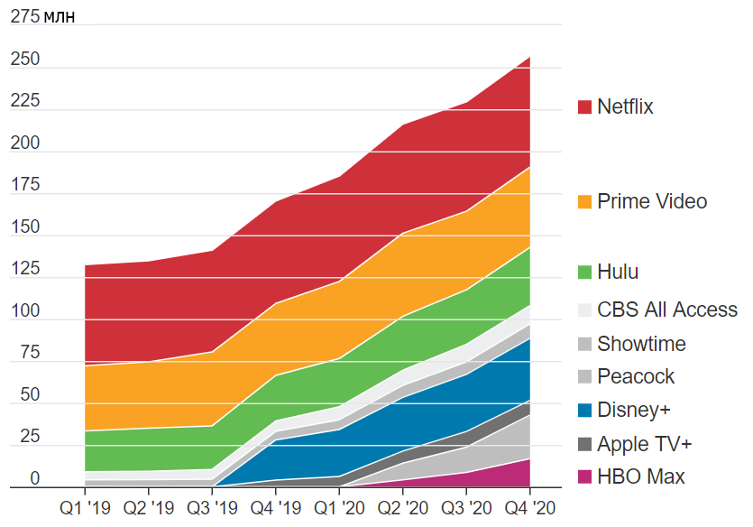 Примечание: В подсчет Hulu не включены подписчики прямого эфира. Показатели Peacock – это подписки. Данные Apple TV + и Prime Video за четвертый квартал приблизительные