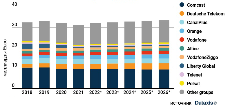 Однако есть и крупные европейские игроки, которые отказываются от экспансии. Так, Liberty Global, которая получила 8% всех прямых доходов от платного телевидения в Европе в 2018 году, в этом году покроет лишь 2% рынка. Это стало следствием продажи холдингом своих кабельных операций под брендом UPC в Германии, Венгрии, Румынии и Чехии группе Vodafone в середине 2019 года. После продажи своих кабельных активов группа возвращается на свои бывшие рынки, начиная с Германии, где она объявила о сотрудничестве с InfraVia Capital Partners для инвестирования в строительство собственных волоконно-оптических сетей.