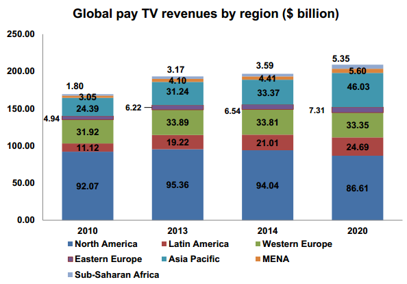 В Северной Америке рынок платного ТВ в ближайшие семь лет уменьшится на 9,2%. Например, в Западной Европе рынок платного ТВ также падает, но более скромными темпами — на 1,6%. Положение спасёт Азиатско-Тихоокеанский регион, где рост выручки операторов платного ТВ будет измеряться $15 млрд (около 47%). Также выручка провайдеров более чем удвоится в регионе Африки южнее Сахары до $5 млрд .